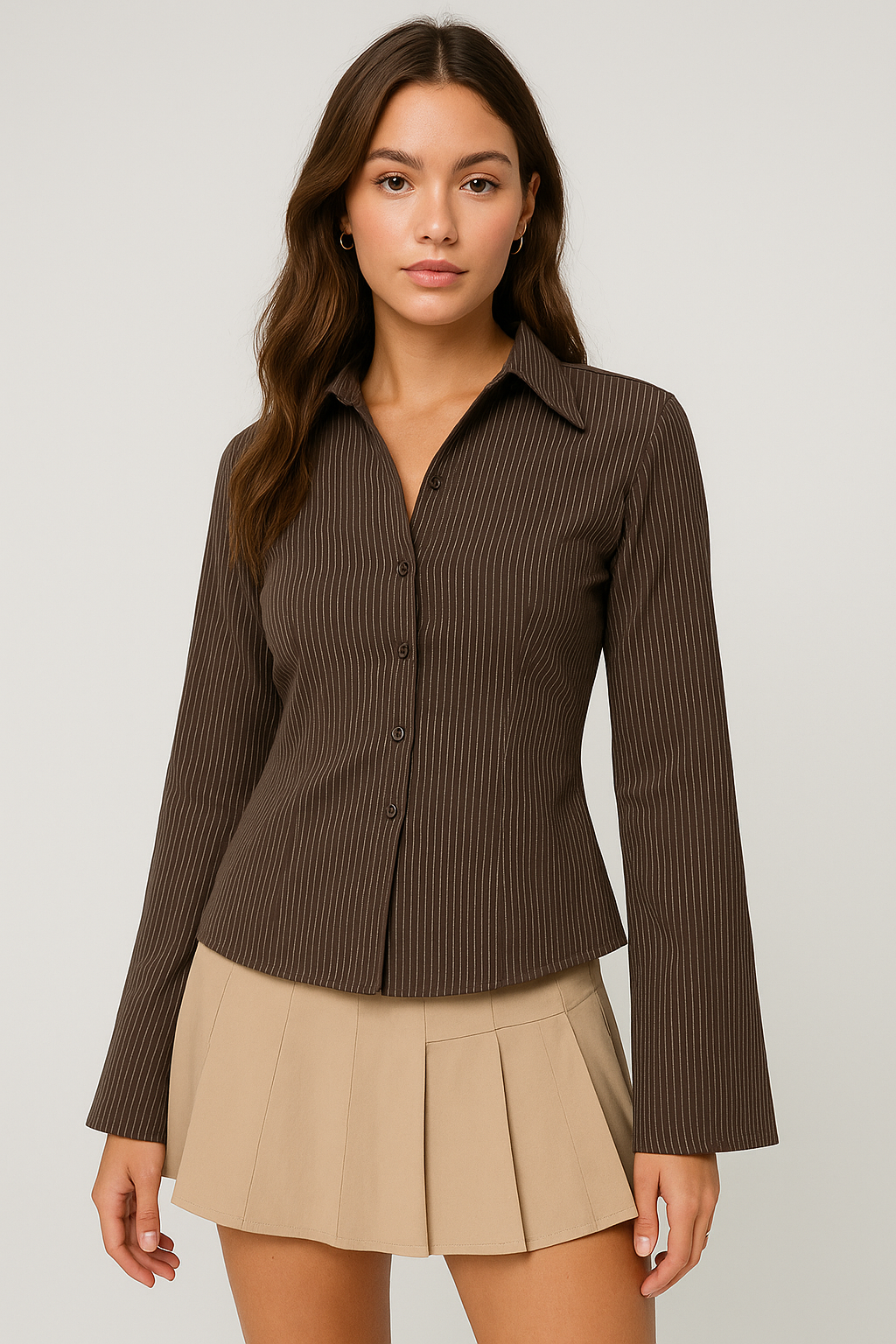 Women’s Brown Pinstripe Fitted Button-Up Blouse – Long Sleeve Shirt for Office & Business Wear
