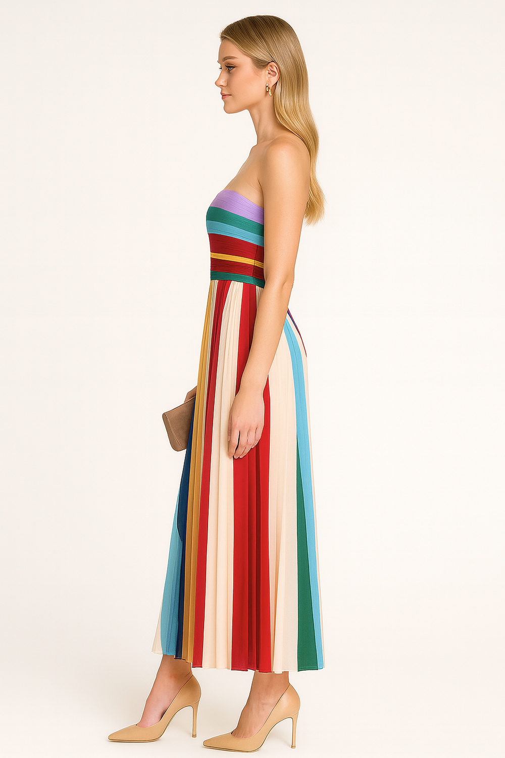 Women’s Multicolor Strapless Pleated Maxi Dress – Vibrant Elegance for Summer Events & Celebrations