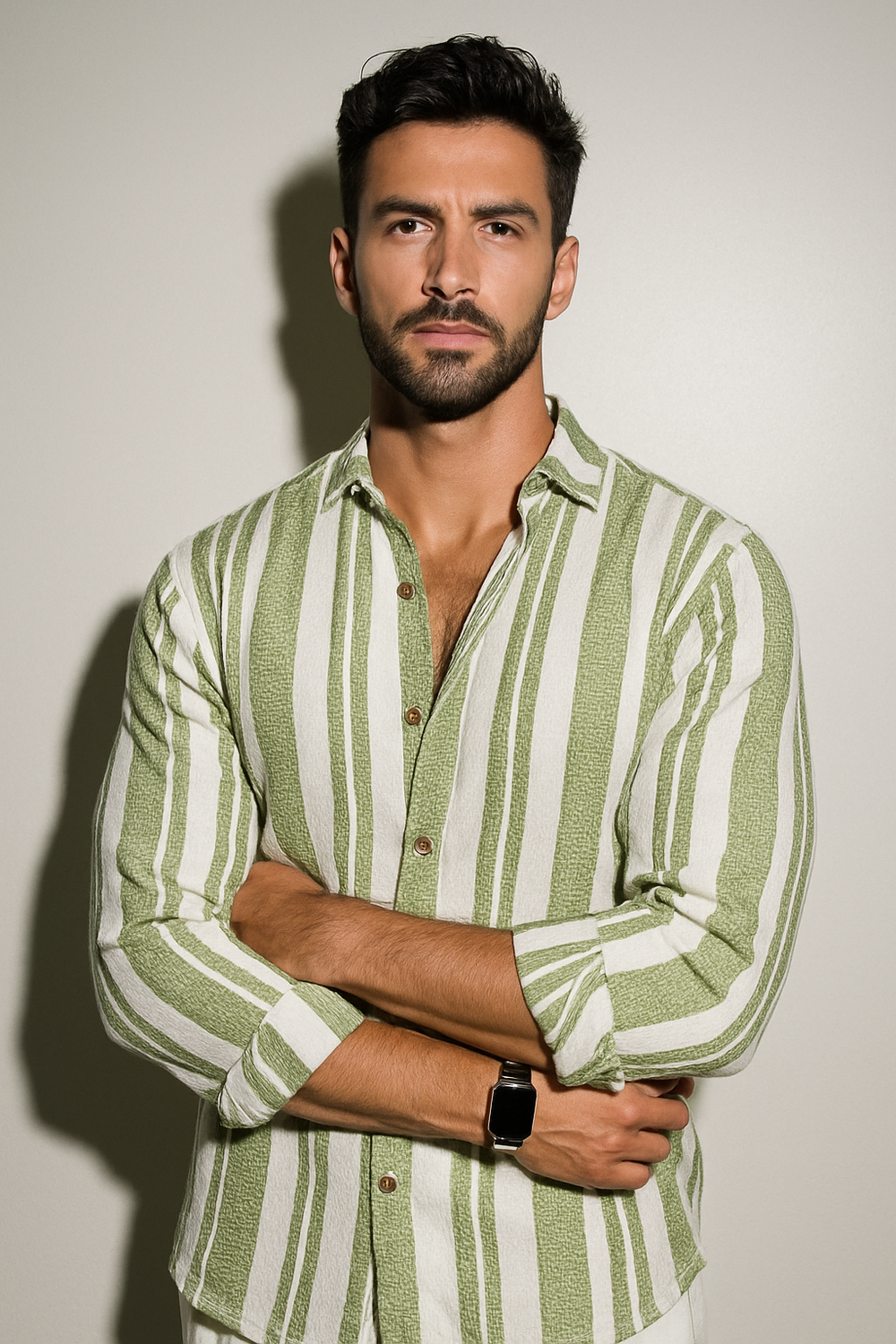 This striped linen shirt is designed for versatility. The linen blend keeps you cool and fresh on warm days, while the modern striped design brings easy-going style to any outfit. Ideal for weekend brunches, summer vacations, beach dinners, or casual office wear.