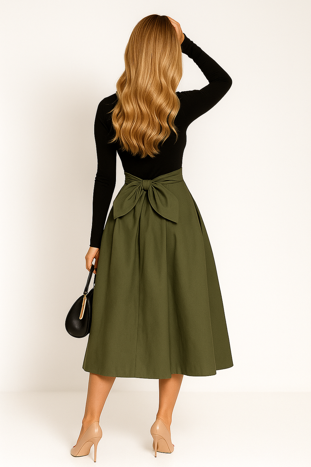 Women’s High-Waisted Midi Skirt with Back-Tied Bow – Refined Structure in Motion