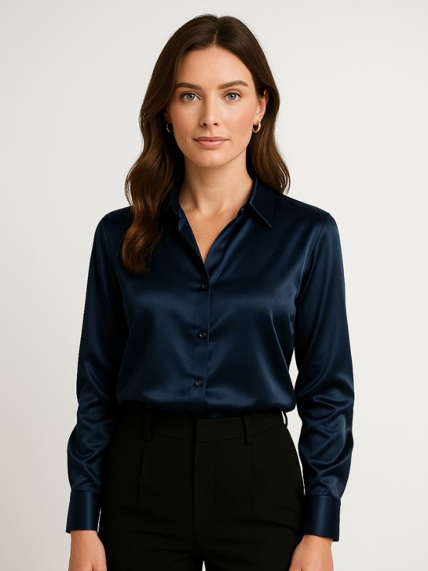Elevate your wardrobe with this silky button-up blouse, a graceful piece that pairs elegance with comfort. Its soft texture and luminous finish make it suitable for both everyday refinement and dressed-up moments, whether styled alone or under a blazer.