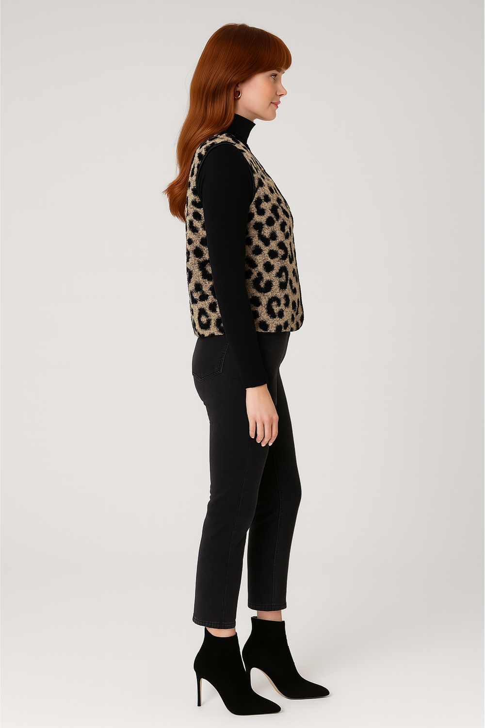 Make a bold statement with this women’s leopard print knit vest, the perfect layering piece for adding warmth and style. Featuring a sleeveless silhouette and a button-front closure, it’s designed for easy wear and versatile styling. Pair it with a long-sleeve top, blouse, or t-shirt to bring a chic, playful edge to your casual outfits during cooler months.