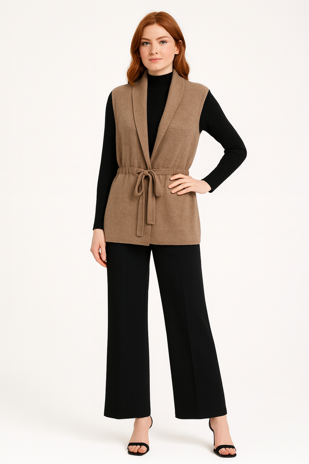 Women's Shawl Collar Vest - Belted Wool-Blend Layer