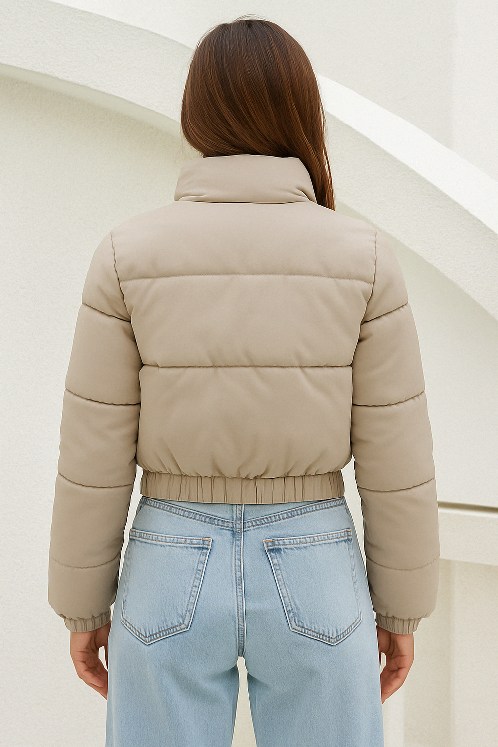 The cropped puffer jacket features a trendy cropped silhouette with a structured design and sleek finish. Its geometric stitching adds a modern edge, while the zipper closure offers a chic focal point. Pair it effortlessly with high-waisted jeans or a midi skirt for a stylish ensemble, perfect for layering in cooler weather.