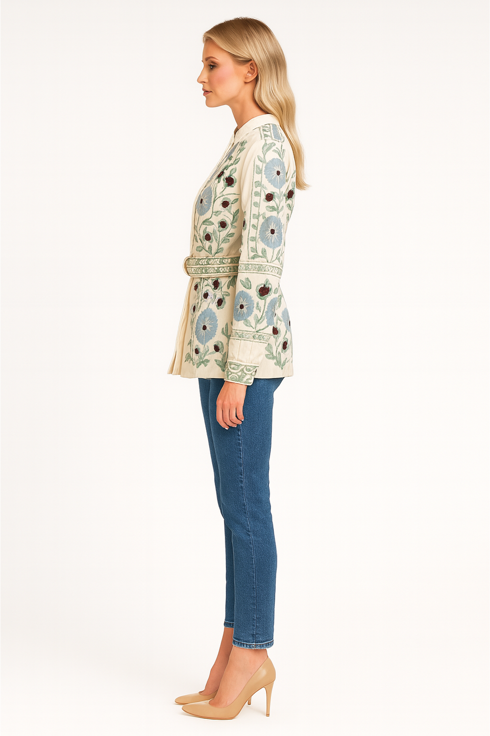 Bring effortless charm to your style with this embroidered floral jacket that blends elegance with versatility. Its lightweight structure makes it comfortable for all-day wear, while the artistic embroidery adds character to any look. Perfect for layering across seasons, this piece transitions seamlessly from casual days to evenings out.