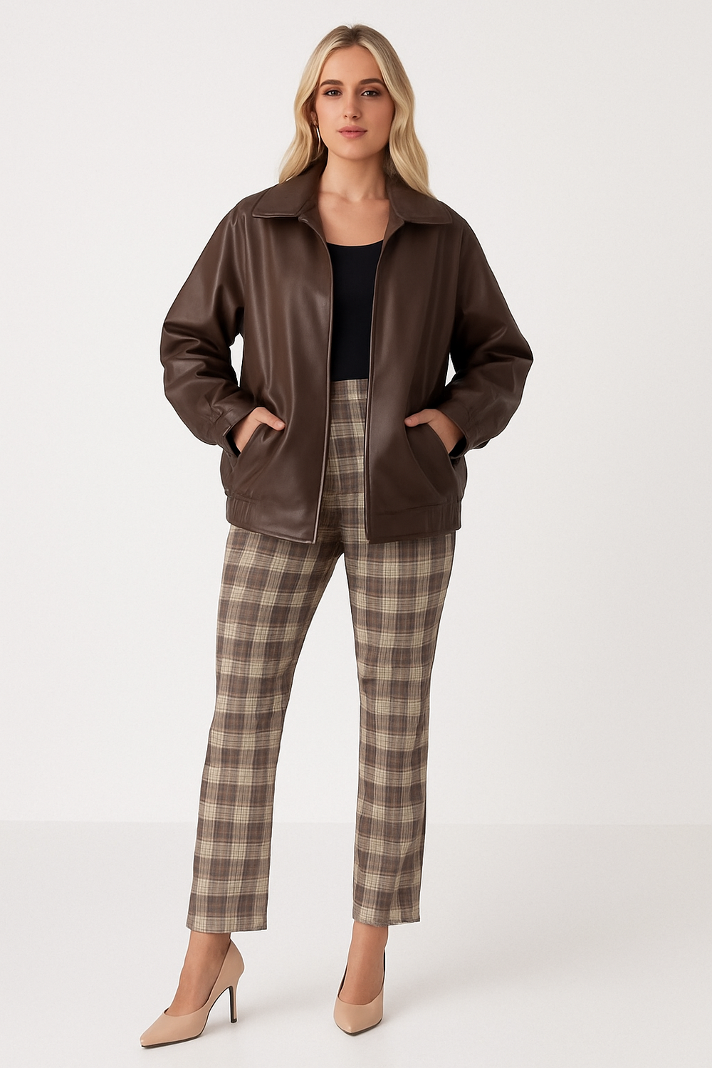 Women's Oversized Leather Bomber Jacket with Front Zip