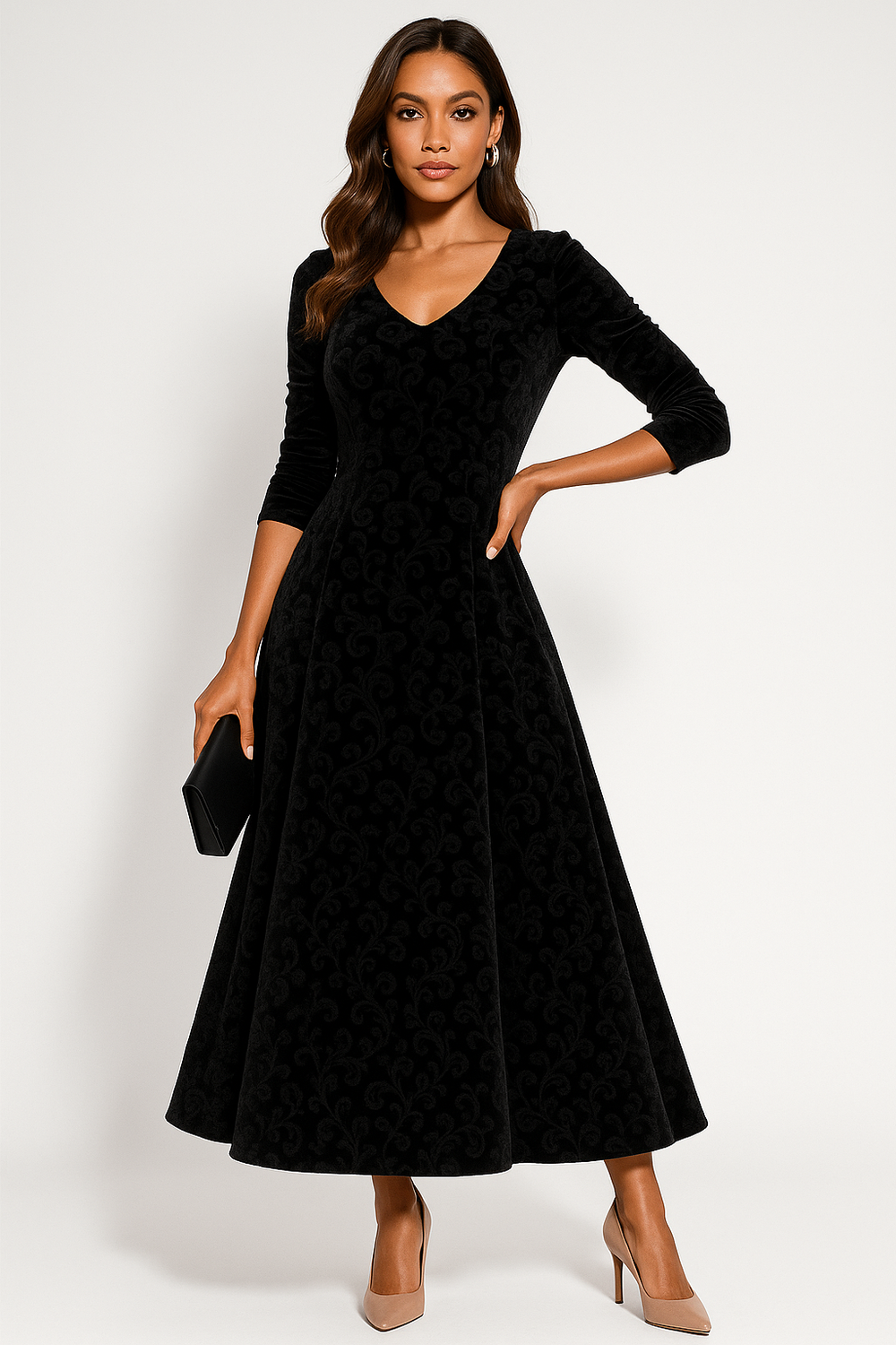 Women’s Velvet Floral Embossed A-Line Midi Dress - Refined Elegance with 3/4 Sleeves for Evening Events, Parties & Winter Occasions
